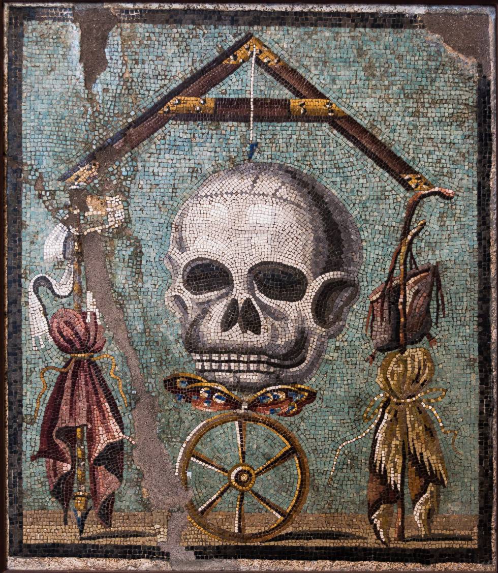 Memento mori (Lembra que morrerás). Mosaico de Pompeia (séc. I a. C.), I, 5, 2, inv. N. 109982. Museo archeologico nazionale di Napoli. Originalmente no chão da sala de jantar (triclínio) de uma casa de verão (Casa I, 5, 2, de Pompéia), este mosaico (em Estilo II [80-20 a. C.]) retrata, em uma clave alegórica e simbólica, o tema filosófico, helenístico, da transitoriedade da vida (e, consequentemente, da iminência da morte). O vértice da composição é uma libella com fio de prumo – a libella era um instrumento utilizado pelos pedreiros romanos para nivelar suas construções. O peso é um crânio (a morte). Abaixo, uma borboleta (a alma) e uma roda (atributo da deusa Fortūna). Em cada lado, suspensos e mantidos em perfeito equilíbrio pela morte, os símbolos de riqueza e poder à esquerda (o cetro e a púrpura) e à direita a pobreza (a bolsa e o cajado do mendigo). O tema deveria lembrar aos comensais a natureza fugaz das fortunas terrenas. Por fim, é notável o cuidado do mosaicista em usar tesselas de diferentes cores (e matizes) para proporcionar uma maior caracterização dos elementos da composição da representação alegórica.