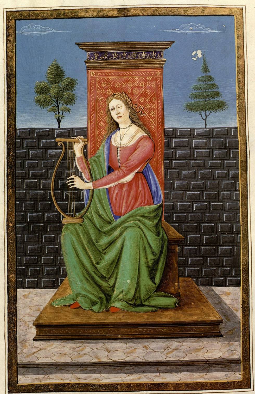 A Harmonia (personificação da Música). Iluminura de Sobre o Casamento da Filologia e Mercúrio (c. 1485-1490), do miniaturista Attavante degli Attavanti (1452-1525). Biblioteca Nazionale Marciana, Lat. XIV, 35, folio 149v.