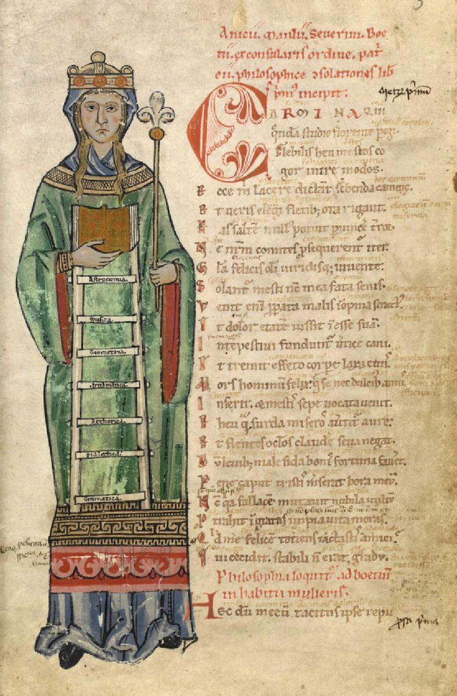 Iluminura de um manuscrito do séc. XIII de A Consolação da Filosofia. A personificação da Filosofia porta um livro. Abaixo, uma escada de sete degraus, alegoria das sete Artes Liberais: Gramática, Dialética, Retórica, Aritmética, Geometria, Música e Astronomia. Universitätsbibliothek Leipzig: De consolatione philosophiae, MS 1253, folio 3r.