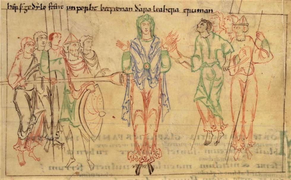 Nessa iluminura anglo-saxã do final do séc. X, de uma cópia ilustrada da Psychomaquia, a Paciência (ao centro), de mãos abertas (símbolo de sua passividade) e com um véu (metáfora de sua pureza), é assediada pela Ira (à esquerda), que instiga a Paciência com uma longa lança (com chamas na extremidade) e é acompanhada por suas forças. À direita, Jó, com três homens armados, oferece uma tocha: a tocha da resiliência. Cambridge, Corpus Christi College, MS 023: Anglo-Saxon Illustrated Prudentius. Orosius (c. 1000-1099), folio 8v.