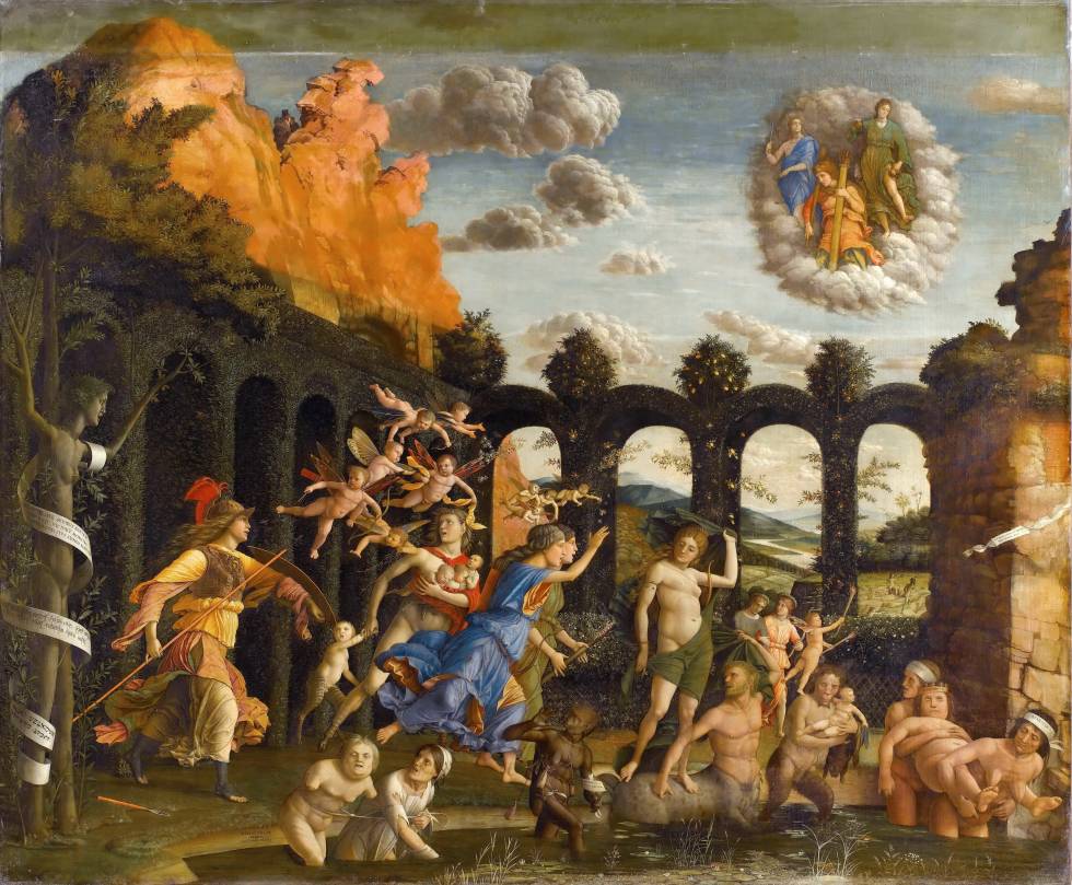 O Triunfo das Virtudes (ou Minerva expulsa os Vícios do Jardim das Virtudes, 1502), de Andrea Mantegna (c. 1431-1506). Têmpera sobre tela, 160 x 192 cm, Louvre, Paris.