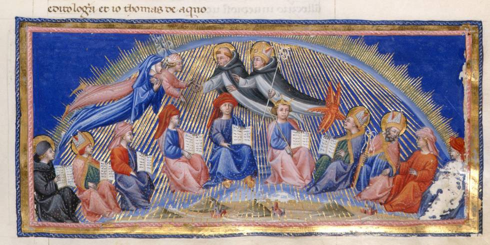 A Esfera do Sol (c. 1444-1450). Iluminura do MS Yates Thompson 36, folio 147. British Library, Catalogue of Illuminated Manuscripts. Atribuído a Giovanni di Paolo (c. 1403-1482). Na iluminura, Dante (de azul) e Beatriz (de rosa, com uma esvoaçante grinalda branca com linhas douradas) são saudados no Quarto Céu do Paraíso, a Esfera do Sol, por Santo Tomás de Aquino e Santo Alberto Magno. Beatriz aponta para baixo, para as outras dez autoridades intelectuais, sentadas abaixo. Da esquerda para a direita, na mesma ordem de exposição do Paraíso, Graciano (da Ordem dos Camaldulenses), Pedro Lombardo, Salomão, Dionísio Areopagita, Paulo Orósio, Boécio (coroado), Isidoro de Sevilha (que contempla fixamente uma estrela rubra de seis pontas aos pés de Alberto Magno), Beda, o Venerável, Ricardo de São Vítor e Siger de Brabante. Ao fundo, abaixo, a Terra, iluminada pelos raios solares.