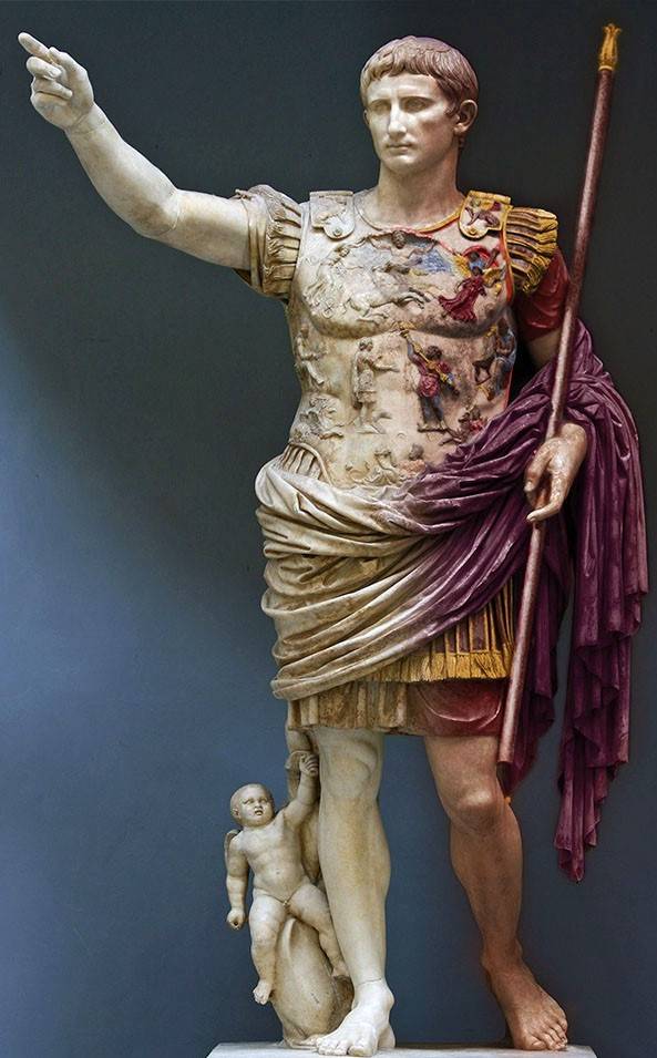 Augusto de Prima Porta (20 d. C., 2,04 m, mármore, com restos de policromia, Museo Chiaramonti, Vaticano, nº 2290). Augusto está representado como o Thoracatus, comandante supremo do exército romano. A obra deve ter sido parte de um monumento comemorativo das últimas vitórias do imperador. History in 3D.