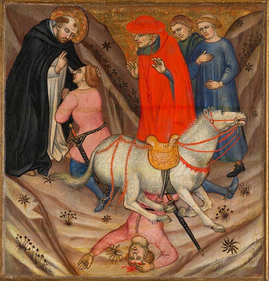 Taddeo di Bartolo (c.1362-1422). Milagre de São Domingos – São Domingos ressuscita Napoleone Orsini (c.1403). Têmpera e ouro em painel, 40 x 38,7 cm (n. 1955.11), McNay Art Museum, San Antonio, Texas, EUA. Napoleone Orsini, sobrinho do cardeal Estêvão, caiu de seu cavalo em uma vala e morreu. Foi então colocado aos pés de São Domingos, que orou por ele e o ressuscitou. O Milagre de São Domingos provavelmente fazia parte de uma predela, registro inferior de um retábulo.