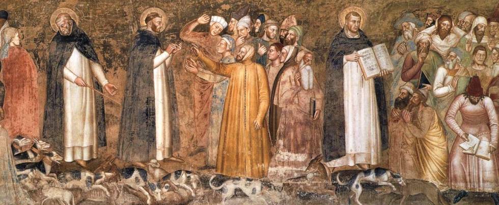 Andrea da Firenze (1343-1415). Detalhe de O Triunfo da Igreja (c.1367). Igreja de Santa Maria Novella, Florença, Itália. Da esquerda para a direita, São Domingos envia uma matilha de cães malhados contra lobos marrons que atacavam um rebanho de ovelhas. A Ordem combate a heresia: ao centro, São Pedro Mártir (1205-1252) e, à direita, Santo Tomás de Aquino (1225-1274) – com um livro aberto – disputam com hereges e pagãos.