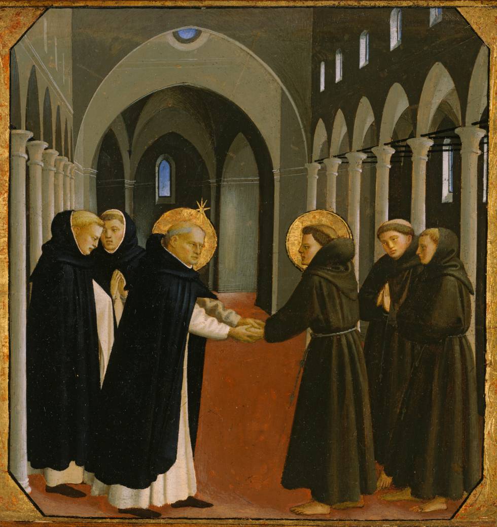 Fra Angelico (1387-1455), O encontro entre São Domingos e São Francisco de Assis (c.1427-1429). Têmpera e folha de ouro em painel, 26 x 26,7 cm. Fine Arts Museums of San Francisco. O respeitoso aperto de mão dos dois santos sela, fisicamente, o compromisso espiritual – evangélico – de pregar a fé: “Ide por todo o mundo e pregai o Evangelho a toda criatura” (Mt 16, 15).
