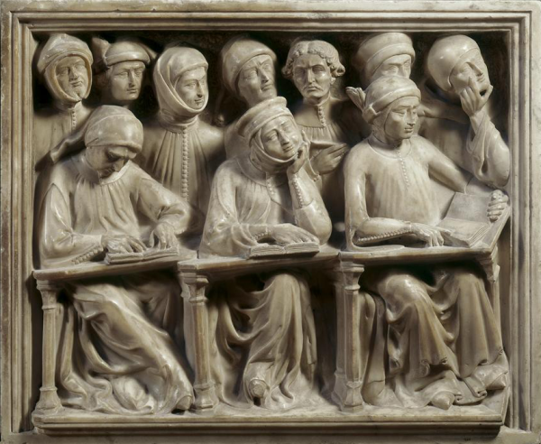 Estudantes da Universidade de Bolonha. Fragmento da tumba de Giovanni da Legnano (†1383), de Pierpaolo dalle Masegne (sécs. XIV-XV) e Jacobello di Bonomo (fl. 1370-90). Museo Civico Medievale, Bolonha, Itália.