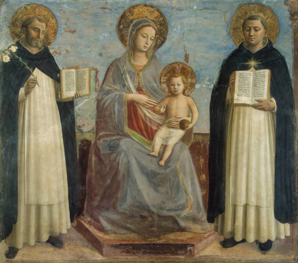 Fra Angelico (1387-1455), A Virgem e a Criança entre São Domingos e Santo Tomás de Aquino (1430). Afresco, 196 x 187 cm, The State Hermitage Museum. À esquerda da Virgem e o Menino, São Domingos (1170-1221), fundador da Ordem dos Pregadores.1 Ele porta um lírio branco em sua mão direita, símbolo da pureza. À direita, Santo Tomás de Aquino (1225-1274), com um livro aberto. Em suas páginas, pode-se ler o texto dos Salmos. Ao contrário dos santos, que têm características individualizadas, a Virgem é idealizada. O Menino Jesus porta a sphaera mundi.2 Além da suavidade das posturas e da delicadeza dos gestos (expressos nas formas das mãos), é Sua imagem que proporciona o sublime lirismo do afresco.