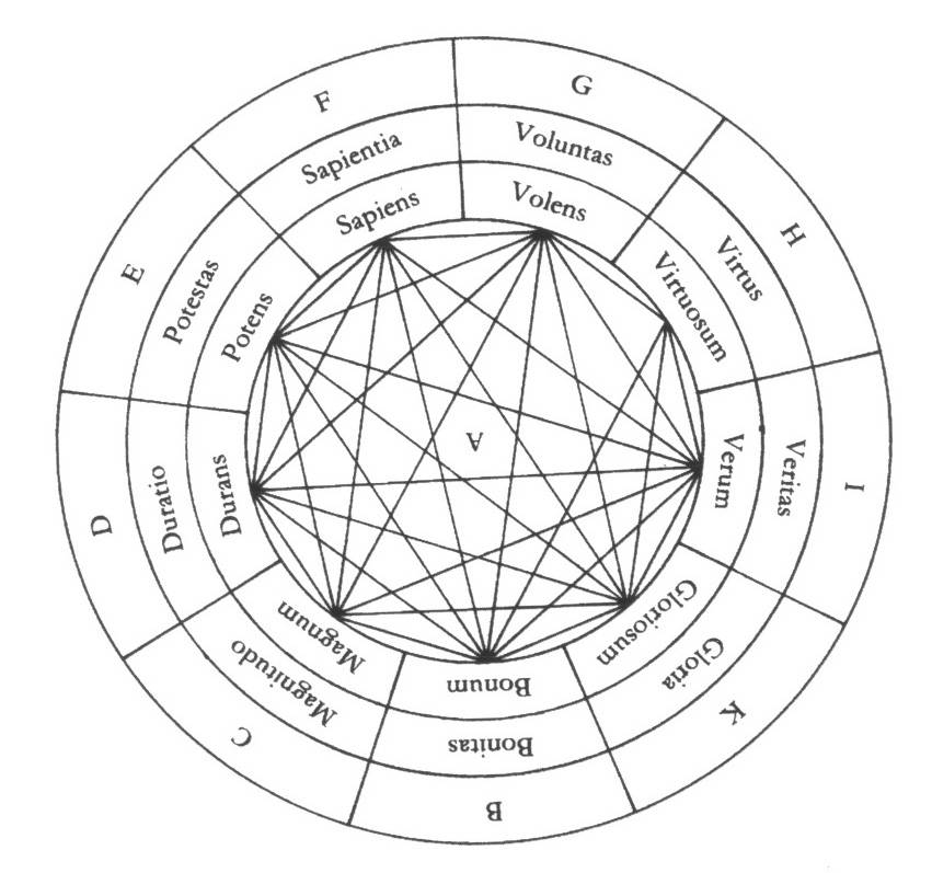 Em uma redação circular, Llull descreve literariamente essa ativa e eterna relação entre as dignidades divinas em seu Livro das Maravilhas (41. Fèlix o Llibre de meravelles, Paris, 1288-1289):