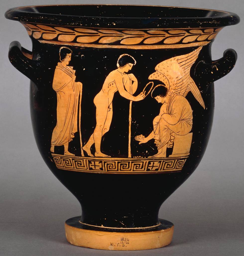 Cratera em sino (c.420-400 a.C.), atribuída ao pintor Amykos (fl. 410-400 a.C.). Lucânia (Grécia), cerâmica de figuras vermelhas, 31,5 x 31,1 cm, British Museum, n. 1856,1226.8. À direita, Eros, com imensas asas esvoaçantes, joga astragali (αστραγαλισμοσ) – tipo de jogo de dados (de ossos) comum na Antiguidade. Envolto em um manto, está sentado em uma base quadrada (plinto). Inclina-se para a frente, atento ao movimento dos astragalis. Ao centro, Ganimedes (Γανυμήδης).1 Nu, apoia-se em um cajado e coloca uma coroa em Eros. À esquerda, outro efebo, também envolto em um manto e com um cajado, observa a cena.