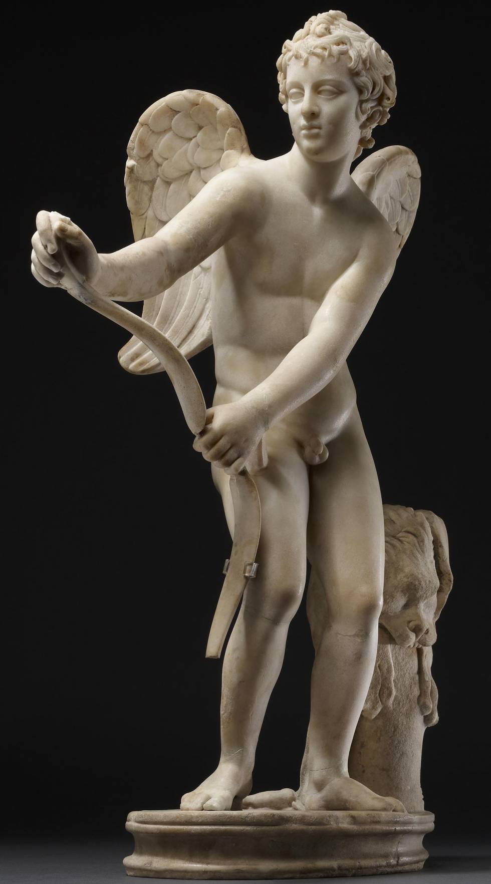 Cupido dobrando um arco (séc. II). Romano, mármore, 59,69 x 44 cm, British Museum, n. 1805,0703.19. Cupido inclina seu corpo para retesar seu arco. Uma pele de leão (à direita) paira sobre sua aljava.