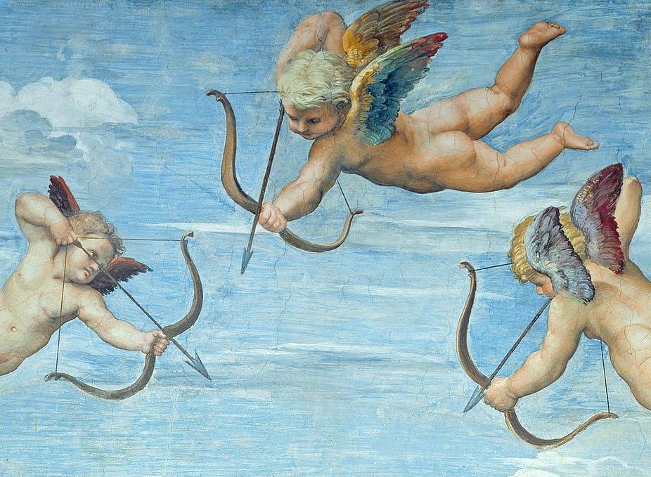 O tema mitológico de Cupido e suas flechas foi poeticamente eternizado por Ovídio (43 a.C.-c.17 d.C.).14 Em suas Metamorfoses (8 d.C.), ao narrar a história de Dafne (Δάφνη), ninfa das águas, Ovídio descreveu um diálogo algo ríspido entre Apolo (Ἀπόλλων) e Cupido.15 Isso porque o orgulhoso deus da luz, das artes e do arco e flecha, ao ver o filho de Vênus retesar a corda de seu arco, debochou de suas capacidades.16