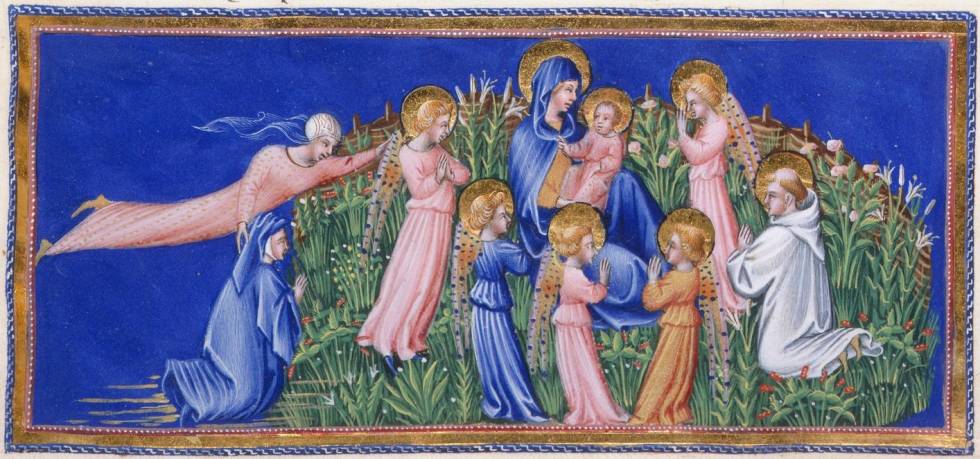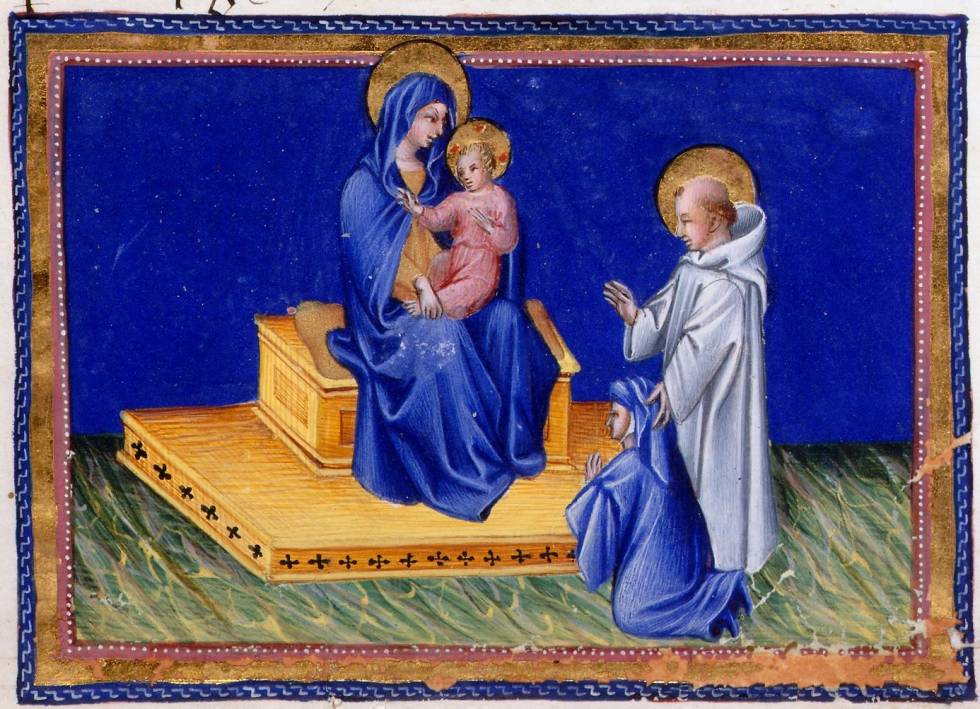 A Virgem, o Menino e São Bernardo. Yates Thompson 36, folio 186. Nessa delicada iluminura da Divina Comédia (Paraíso, XXXIII) atribuída ao pintor e iluminista sienês Giovanni di Paolo (c. 1403-1483), Dante e Beatriz (à esquerda) chegam a um locus amoenus com a Virgem e o Menino rodeados por cinco anjos e São Bernardo (de joelhos, à direita, com o hábito branco cisterciense).