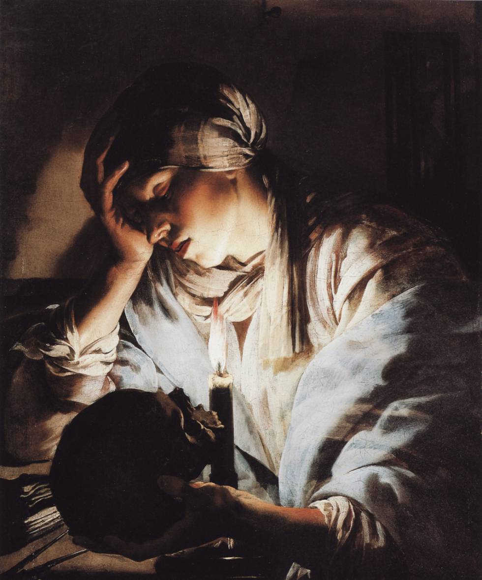 Como filho de seu tempo, Hendrick ter Bruggen (1588-1629) estava familiarizado com a teoria hipocrática (e medieval) dos quatro humores (como explicaremos a seguir) e a imagem da Melancolia como um tema artístico. Sua contribuição ao tema mostra a Melancolia (identificada pelos especialistas) como Maria Madalena, de luto pela morte de Jesus (imagem 3).12 Imersa em seus pensamentos, os olhos semicerrados da mulher contemplam um crânio porque o espírito melancólico se volta para seu mundo interior e considera o tema dos temas da Filosofia clássica: a morte.13 A Melancolia do artista manifesta uma expressão quase estoica pois, caso seja verdadeira a hipótese de o personagem ser Maria Madalena, a meditação da morte (corporal) do Filho de Deus é a máxima expressão do tema e, por isso, é necessário a representação da máxima melancolia possível. A opção do artista foi ressaltar o momento introspectivo com o jogo de luz e sombra proporcionado pela projeção da luminosidade da vela no rosto do personagem.