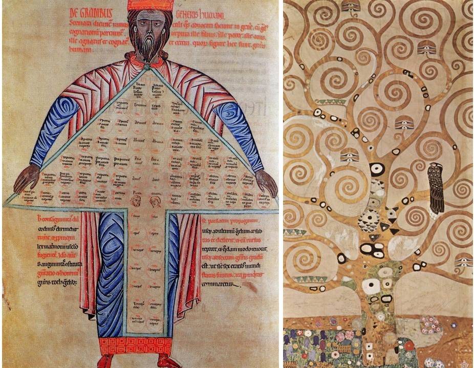 Detalhe da iluminura V do Breuiculum (c. 1325, St. Peter perg. 92, folio 5r), manuscrito com recopilações de obras do filósofo Ramon Llull (1232-1316) feito às expensas do discípulo do filósofo catalão, o médico parisiense (e cônego de Arras) Thomas Le Myésier (†1336). Nele, há doze iluminuras que narram a Vita coaetanea (1311), autobiografia de Llull. À esquerda, nove filósofos (que representam as nove dúvidas possíveis sobre os nove sujeitos do Universo) fazem nove perguntas à escada da Arte; ao centro, Llull explica seu método filosófico; à direita, a torre da confiança, da sabedoria e da verdade – de cima para baixo, a Trindade, três anjos (que representam a Vontade, o Intelecto e a Memória) e as sete virtudes necessárias para se ascender intelectualmente (Justiça, Fortaleza, Temperança, Prudência, Humildade, Paciência e Piedade).