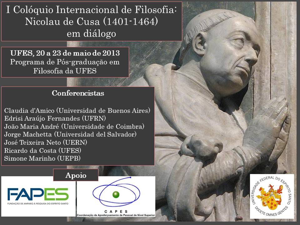 - 257. Os conferencistas (e seus temas) foram: Prof. Dr. Paul van Tongeren (Radboud University/Nijmegen-Holanda) – “Kritik und Selbstkritik bei Nietzsche”; Profª Drª Ângela Vaz Leão (UFMG) – “As Cantigas de Santa Maria de Afonso X, o Sábio”; Prof. Dr. José María Salvador González (Universidad Complutense de Madrid - UCM) – “La Estética de San Buenaventura como fuente iconográfica del arte de la Baja Edad Media”; Profª Drª Giannina Burlando (Pontificia Universidad Católica de Chile) – “Impracticabilidad del Dasein ontológico de Heidegger”; Prof. Dr. Jorge Augusto da Silva Santos (UFES) – “A preleção cancelada de 1918/1919 de Martin Heidegger: Os fundamentos filosóficos da Mística Medieval” e Prof. Dr. Ricardo da Costa (UFES) – “A anamnese estética de Umberto Eco”.