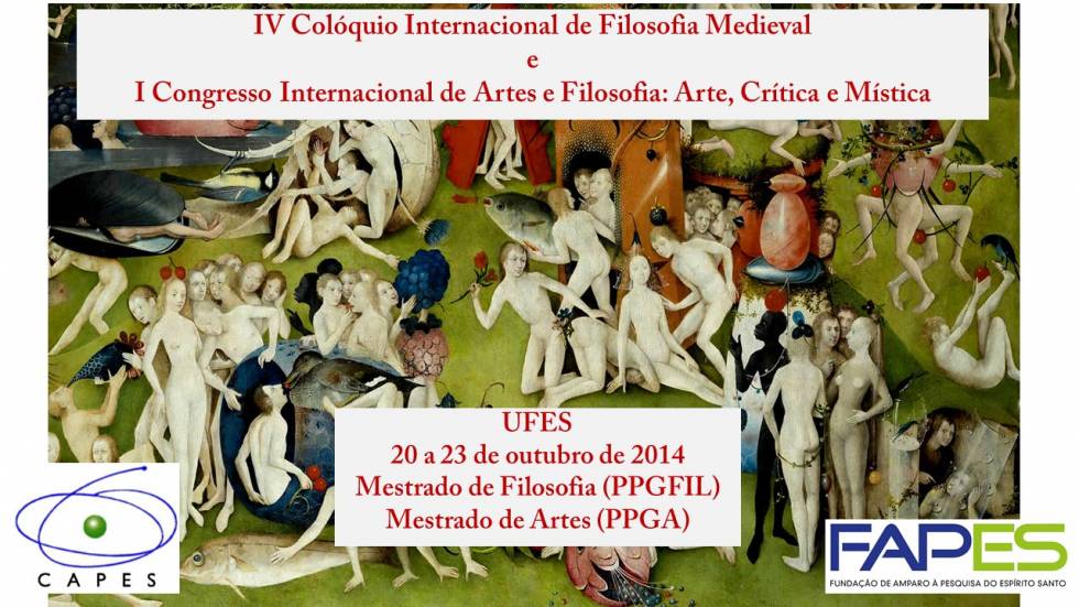 - 287. Conferências: 1) Prof. Dr. Hélio Angotti Neto (UNESC) – O corpo humano na Medicina, 2) Prof. Dr. Antonio Cortijo Ocaña (University of California, Santa Barbara) – La Pasión de Cristo y la representación del cuerpo a fines de la Edad Media, 3) Prof. Dr. Aparecido Jose Cirilo (UFES/PPGA) – O corpo autobiográfico como lugar em Elisa Queiroz (1970-2011), 4) Profa. Dra. Angela Grando (UFES/PPGA) – Bill Viola (1951-), um investigador da alma, 5) Prof. Dr. Alexandre Emerick Neves (UFES/PPGA) – Figurações e desfigurações entre corpos, caminhos e lugares, 6) Prof. Dr. Òscar O. Santos-Sopena (West Texas A&M University) – Interculturalidad del cuerpo en el Mediterráneo humanista, 7) Profa. Dra. Almerinda da Silva Lopes (UFES/PPGA) – O martírio do corpo em uma pintura moderna: fricção entre história, memória e anacronismo, 8) Prof. Dr. David Ruiz Torres (UFES/PPGA) – De ciborgues e cibercorpos: representações do trans-humanismo na Arte, 9) Prof. Dr. Antonio Celso Ribeiro (UFES) – O gesto como fenômeno intertextual na Música, 10) Prof. Dr. Ricardo Mauricio Gonzaga (UFES/PPGA) – Corpos em metamorfose: propostas de superação dos limites do corpo na arte contemporânea, 11) Prof. Dr. Luiz Astorga (Universidade Católica do Chile) – Os anjos têm corpos?, 12) Prof. Dr. Dr. Vicent Martines (Universitat d’Alacant): Ut pictura poiesis: pintura y arte verbal en el siglo XV, 13) Prof. Dr. José María Salvador González (Universidad Complutense de Madrid) – (Des)figuraciones moralizantes en la pintura de Bosch, e 14) Prof. Dr. Ricardo da Costa (UFES/PPGA): A serena felicidade dos corpos góticos (no Youtube: Parte 1 e Parte 2).