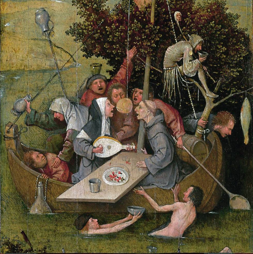 Detalhe de A nave dos loucos (c. 1490-1500) de Hieronymus Bosch (1450-1516). Óleo sobre madeira, 57,8 x 32,5 cm, Louvre, Paris. Uma metáfora iconográfica do desequilíbrio que acomete todos os destemperados passageiros da Loucura, lunáticos por natureza23, nós, contemplativos.