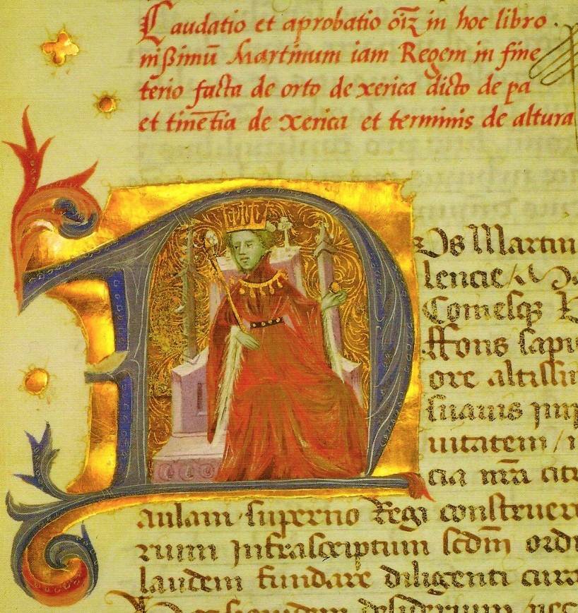 Letra capitular iluminada com o rei Martim I, o Humano. Livro dos Privilégios da Cartuxa de Vall de Cristo. Codex C. 1385 (primeira metade do século XV). Biblioteca da Catalunha, Barcelona, Espanha.