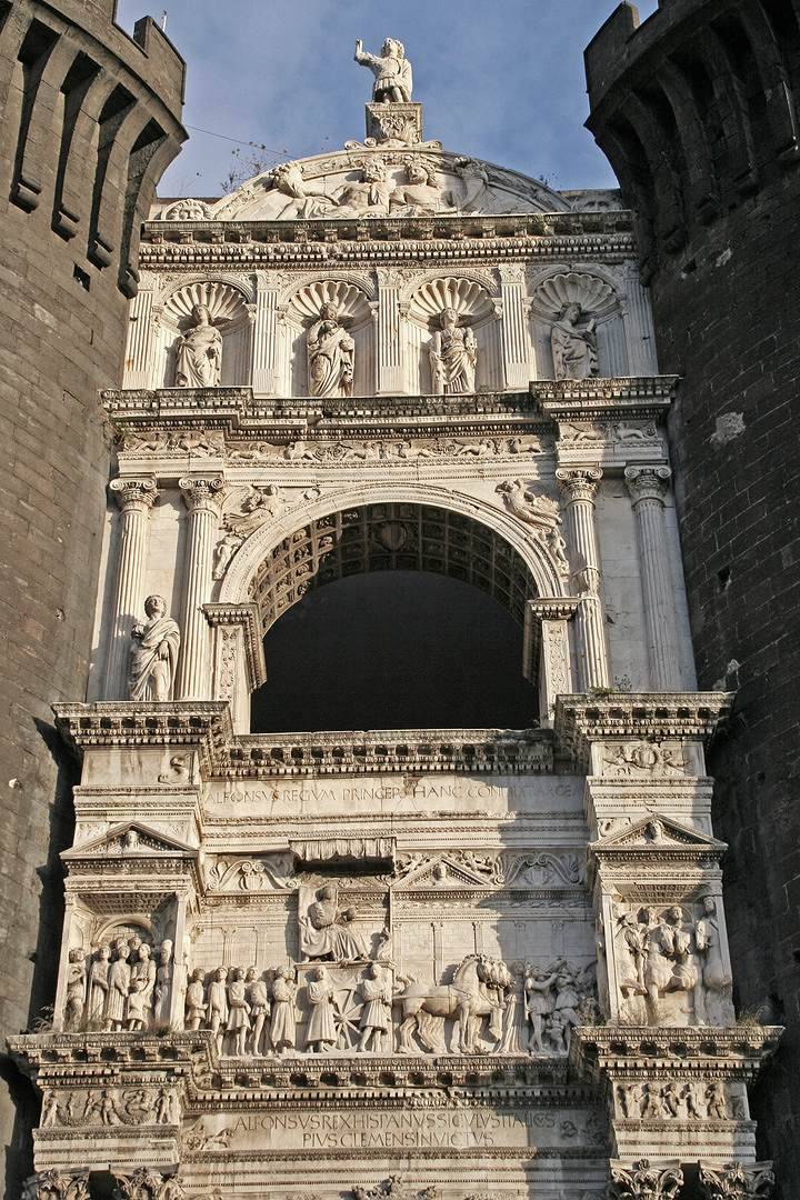 Arco triunfal de Afonso de Aragão (1453-1458), entrada para o Castel Nuovo, em Nápoles. Destinava-se a comemorar o arco temporário erguido em frente à catedral quando o rei Afonso entrou triunfalmente na cidade, em 1443. O mestre catalão Pere Joan (fl. 1400-58) supervisionou o projeto. Sob sua direção, Pietro da Milano (c.1410-1473), escultor lombardo que passou seus primeiros anos trabalhando em Ragusa, na Dalmácia, supervisionou o trabalho de pelo menos cinco mestres escultores (incluindo Francesco Laurana [c.1430-1502]) e trinta e três assistentes. O trabalho escultórico foi alocado a diferentes trabalhadores, o que garantiu a rápida conclusão do projeto. De 1455 a 1458, Isaías de Pisa (fl. 1447-1464) trabalhou no arco, embora sua contribuição para o programa escultórico seja controversa – provavelmente em seus campos inferiores.44