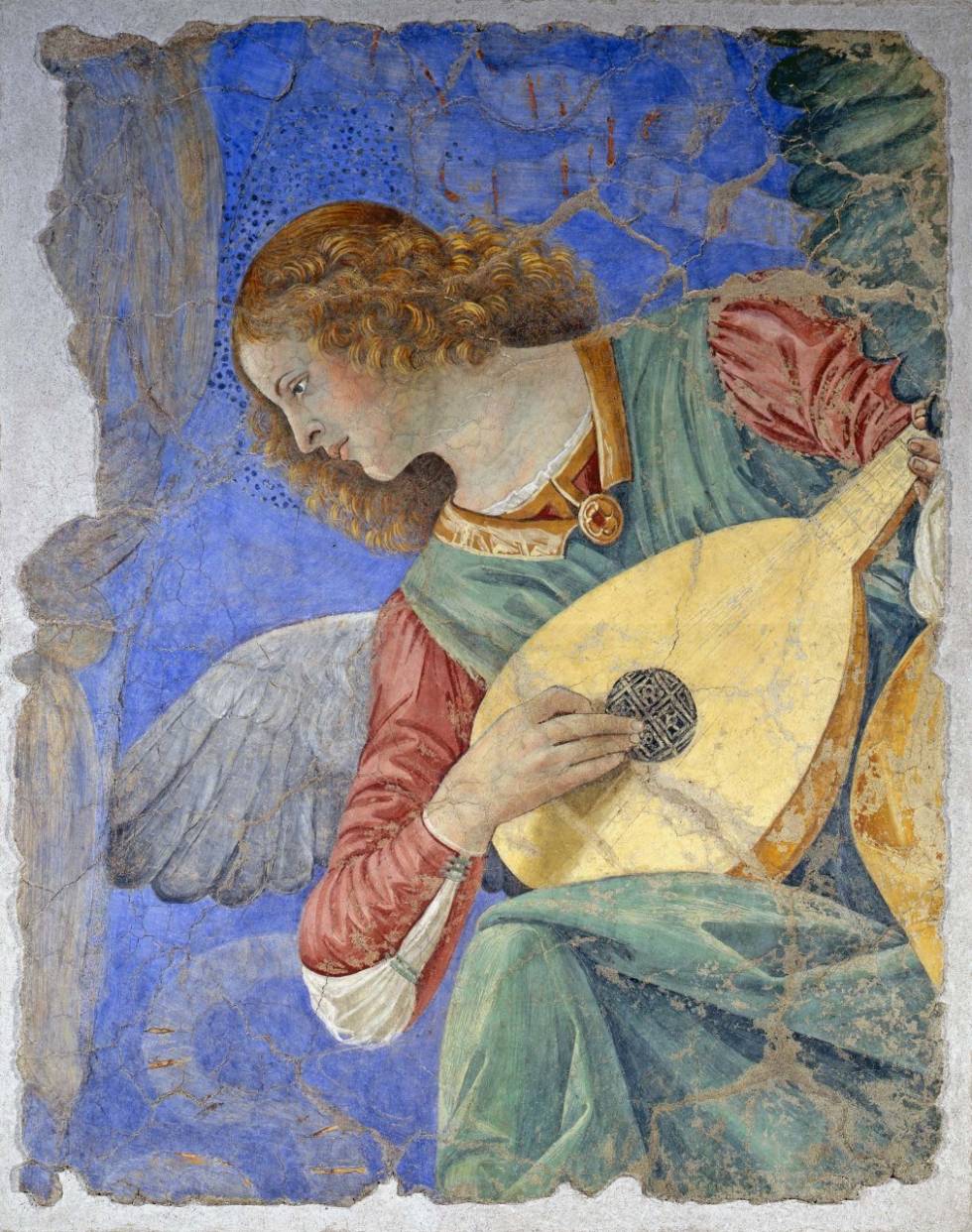 Um anjo tocando um alaúde (c.1480), de Melozzo da Forli (1438-1494). Fragmento de afresco removido, 93,5 x 117 cm, Mvsei Vaticani, Cat. 40269.14.10.49