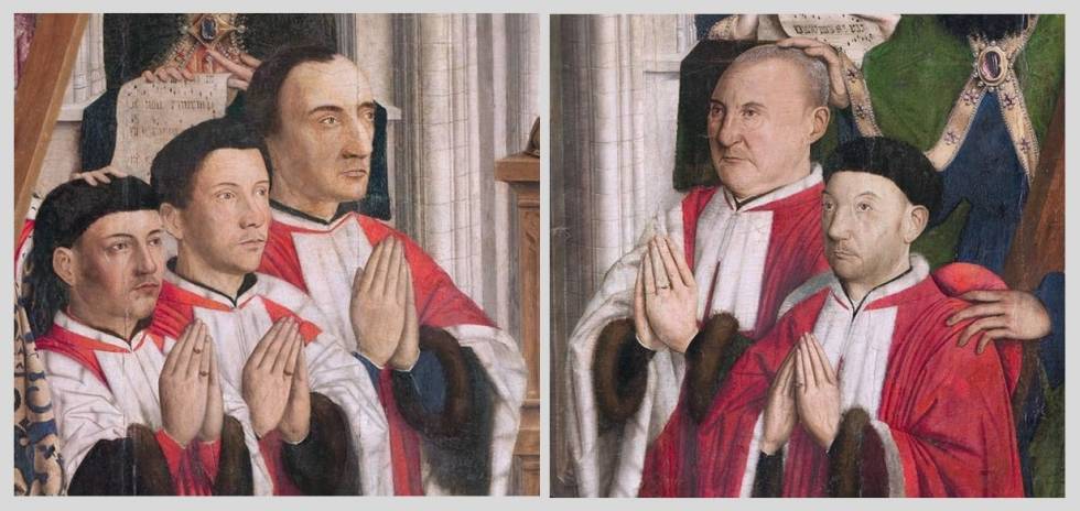 Hubert (c.1385-1426) e Jan van Eyck (c.1390-1421). Metade superior do políptico intitulado Retábulo de Gante (ou Adoração do Cordeiro Sagrado), 1430-1432, 3,75 (altura) x 5,2m (comprimento). Catedral de São Bavo, Ghent, Bélgica. Representa a redenção celestial – com o clássico arranjo da deesis (δέησις) de Deus (identificado como Cristo Rei ou Deus Pai), ladeado pela Virgem e João Batista que, por sua vez, são ladeados por anjos músicos e Adão e Eva.