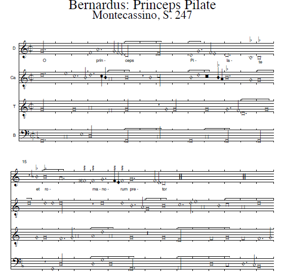Primeira página da peça Princeps Pilate de Bernadus transcrita em notação moderna pelo Dr. Clemens Goldberg, disponível na Goldberg Foundation para consulta e performance.