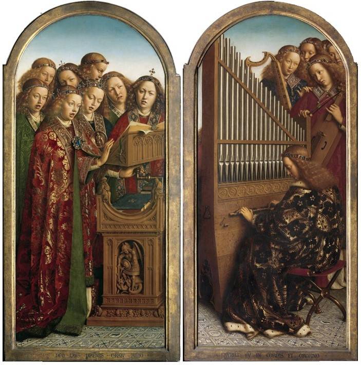 Anjos cantando (à esquerda) e anjos tocando (à direita). Detalhes da metade superior do Retábulo de Gante (ou Adoração do Cordeiro Sagrado), 1430-1432, 3,75 (altura) x 5,2m (comprimento). Catedral de São Bavo, Ghent, Bélgica. Os anjos cantores do painel à esquerda portam paramentos litúrgicos do início do século XV e interpretam o Gloria in excelsis Deo. Van Eyck incorporou a Ars nova, movimento musical introduzido na Borgonha por Guillaume Dufay (c.1397-1474) e Gilles Binchois (c.1400-1460). As melodias da Ars nova expressavam os distintos estados de espírito da alma. Graças ao realismo de Van Eyck, a julgar pelas expressões faciais, podemos supor que os anjos cantam polifonicamente e, pela posição de suas bocas, quem canta qual voz: soprano, contralto, tenor ou baixo. Eles estão ao redor de um atril giratório em um móvel esculpido com uma imagem de São Miguel matando o dragão (Ap 12,7) e dois profetas (um deles, Isaías). No painel à direita, um anjo toca órgão e outros dois (com uma harpa e uma viola) aguardam seu momento para tocar. Nos ladrilhos do piso, a inscrição AGLA (Atta Gibbor Le’olam Adonai – “O Senhor é sempre todo-poderoso”).