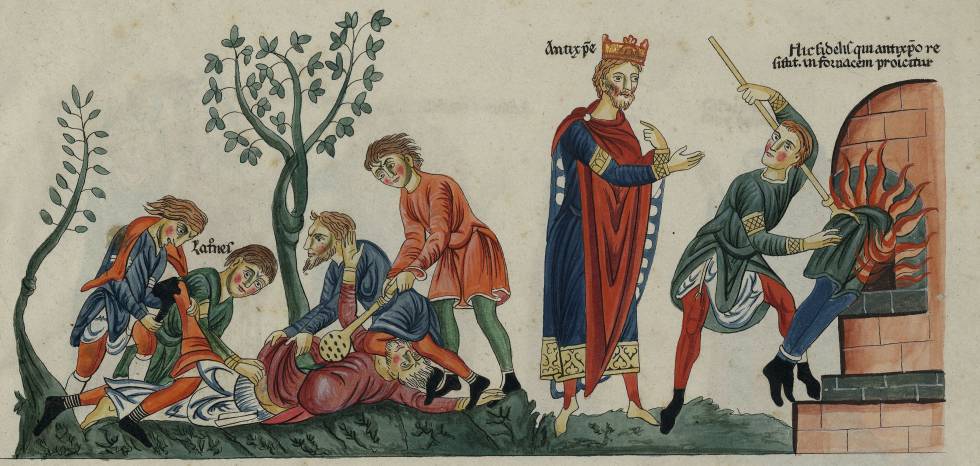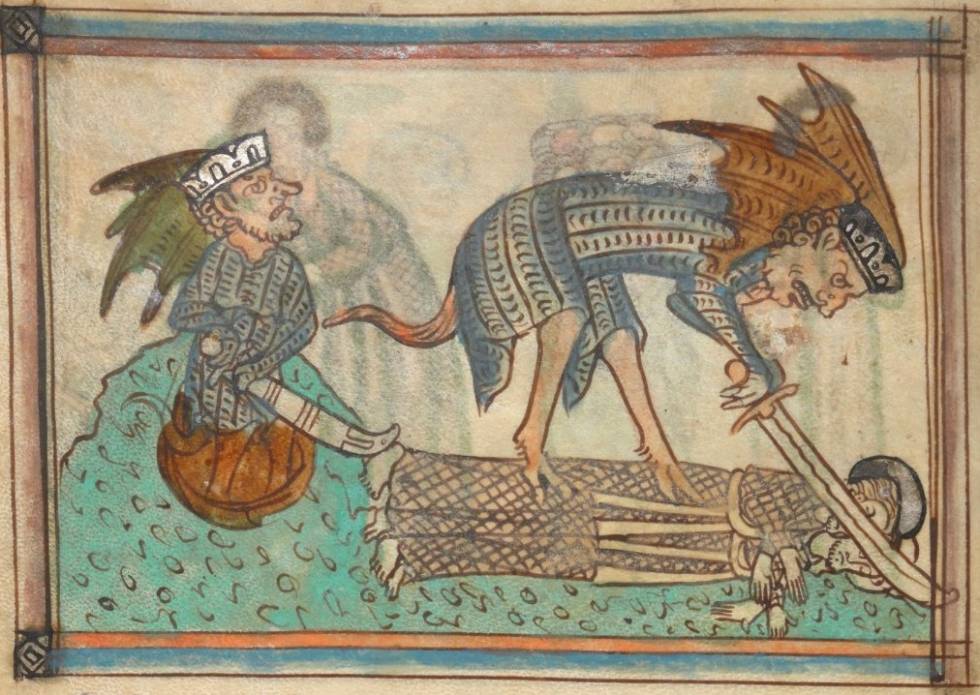 O Anticristo assassina duas testemunhas (Ap 11, 7: A morte das testemunhas). Apocalipse em latim e anglo-normando francês (início do séc. XIV), Royal MS 2 D XIII, folio 23v.