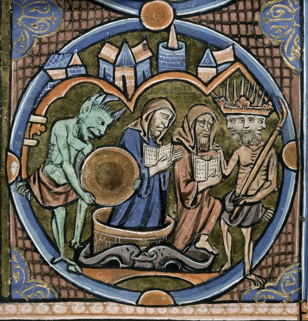 Detalhe da rodela inferior na coluna da direita do folio, com o Diabo (à esquerda), possivelmente o Anticristo como Janus (só que não bifronte, como de hábito, mas com três faces), e dois homens com livros abertos, um dos quais dentro de um tonel. Bíblia Moralisada (séc. XIII), iluminura, Harley 1527, British Library, folio 127.
