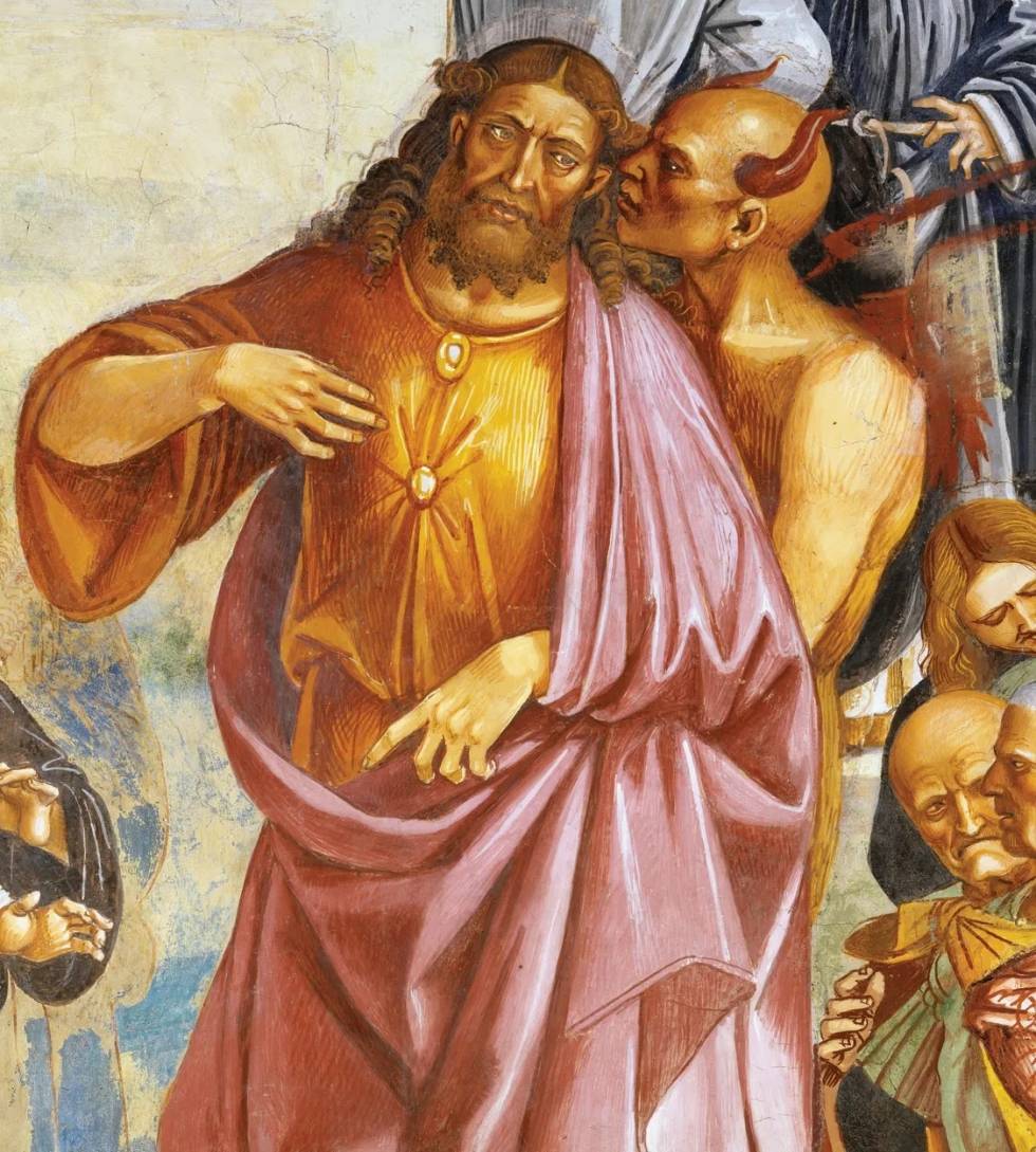 O Anticristo de Signorelli tem as feições do Cristo, mas é uma máscara do demônio: seus olhos são turvos; seus cachos lembram chifres!