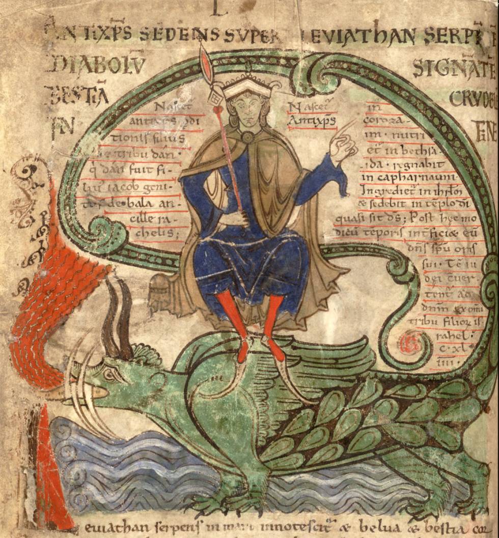 O Anticristo sentado no Leviatã (séc. XIII). Lambert de Sant Omer (c. 1061-?). Liber Floridus (O Livro das Flores, c. 1090-1120). BNF, Manuscrits, Latin 8865, folio 62v. Nessa iluminura de uma enciclopédia medieval – seu manuscrito, preservado, ainda que incompleto, se encontra na Biblioteca da Universidade de Ghent) – o Anticristo, coroado, com um cetro (cuja ponta, vermelha, aponta para um texto acima, citação da obra do abade Adso de Montier-en-Der [c. 910-992]), está entronado sobre a cauda do Leviatã, um dos grandes monstros marinhos do imaginário Ocidental, o mais terrível de todos, porque simboliza as forças do Mal, aquele que só a espada de Deus conseguirá matar.