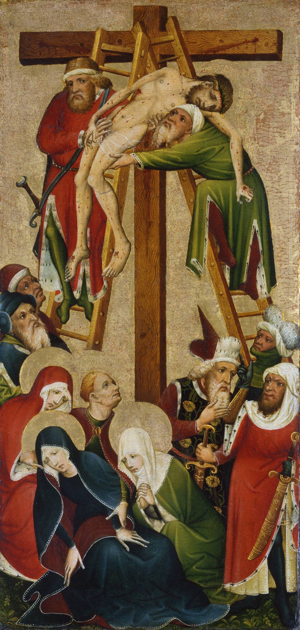 Na parte superior, José de Arimatéia e Nicodemos amparam, com muita delicadeza, o corpo de Cristo, que se verga para a direita do espectador. Seu rosto acentua Sua dor28; Seu corpo, salpicado com gotas de sangue, está quase nu: ao invés da tradicional túnica, como o mestre de Forlì e Duccio, o anônimo alemão mal cobre Suas partes íntimas, pois o tecido, perolado, é translúcido (e José de Arimatéia cobre Seu sexo com a mão direita). As duas escadas dos dois personagens formam um triângulo com a cruz. As cores de suas vestes são opostas: o vermelho e o verde se alternam ritmicamente.29