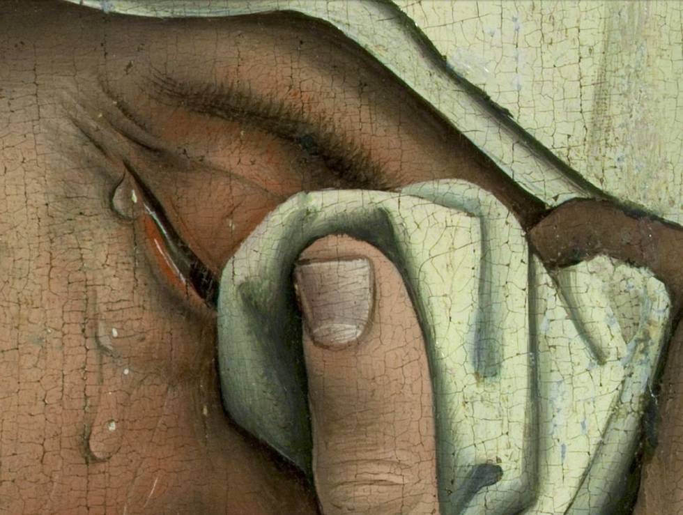 O pranto coroa esse páthos do sofrimento.44 É sua expressão mais significativa. À esquerda, o choro de Maria de Cleófas (imagem 11) se destaca: cabeça baixa, nariz avermelhado, o lenço a enxugar as lágrimas. O espectador é convidado a deter-se na eloquência das lágrimas da personagem. Esse olhar, mais íntimo, desfruta a transparência das gotas lacrimais salpicadas de luz, cujas sutis sombras as fazem fluir sobre a face e perfazer os volumes e reentrâncias de sua pele rosada. Vemo-nos ante a dolorosa atmosfera manifesta na profusão de lágrimas que o lenço apertado contra os olhos não é capaz de conter (imagem 12). Percebe-se, mais uma vez, a herança da estética naturalista medieval à representação da humanidade de Cristo.45
