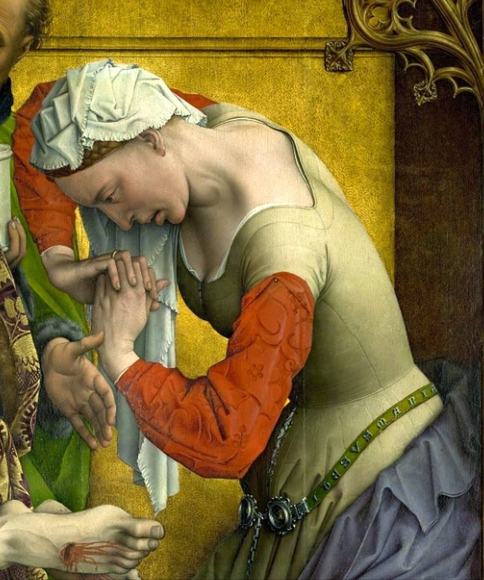 A composição de van der Weyden sugere que as cenas que consolidaram a temática do Descendimento no imaginário cristão ocidental tenderam a se tornar, estilisticamente, mais complexas e com mais minúcias a serem visualmente “descobertas” por seus fiéis (além das duas figuras principais, Mãe e Filho). Por exemplo, o detalhe da inscrição IEHSVS MARIA no cinto que adorna a cintura de Maria Madalena52, no flanco direito da pintura, aparenta repreender os espectadores, pois admoesta aqueles que correram seu olhar pelas curvas do corpo da seguidora do Cristo a relembrarem sua atenção à piedade que a santas figuras evocam.53