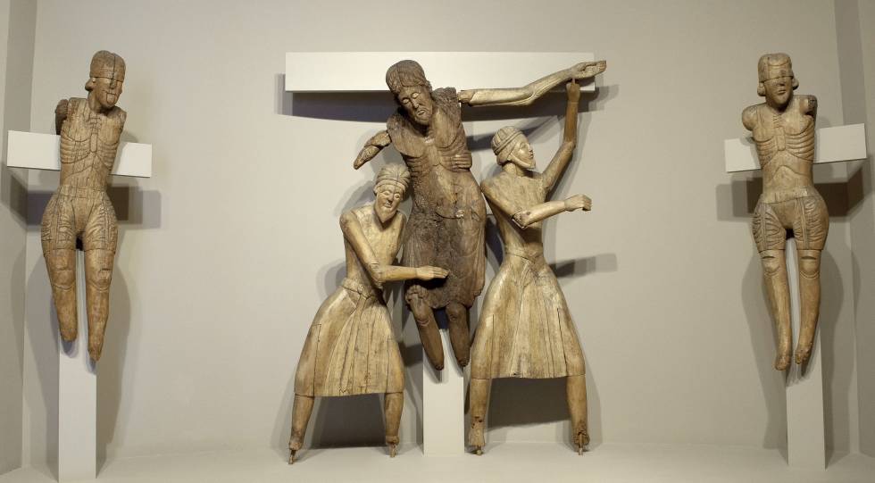 Descendimiento de Erill la Vall (séc. XII), do Mestre de Erill. Álamo e madeira de nogueira com traços de policromia, 131 x 31 x 50 cm; 134 x 68 x 27 cm; 147 x 126 x 41 cm; 155 x 58 x 44 cm; 136 x 33 x 59 cm. Museu Episcopal de Vic, Espanha. Trata-se de um importante conjunto da escultura românica europeia do século XII por sua excepcional qualidade. A cena representa o momento em que Nicodemos destrava a mão de Cristo da cruz, enquanto José de Arimatéia segura Seu corpo nos ombros. À esquerda do observador, o ladrão Dimas, com a língua estendida; à direita, o ladrão Gestas. Conforme a articulação dos braços, presume-se que a peça fosse utilizada em dramas litúrgicos da Páscoa, representados nas igrejas na Semana Santa. O estudo esquemático da anatomia do corpo de Cristo, bem como o movimento contido de José de Arimatéia e Nicodemos mostra que o artista expressou o páthos do momento com uma surpreendente linguagem escultural. O nome do mestre que fez essas esculturas é ignorado, mas elas foram atribuídas a uma hipotética oficina de Erill, ativa durante a primeira metade do século XII.