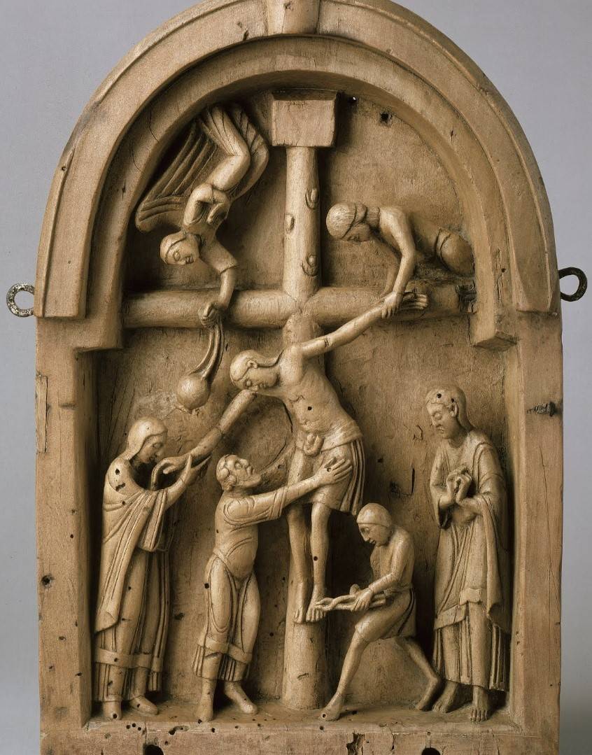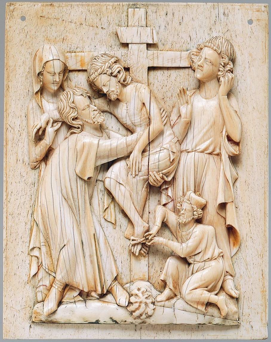 Placa com o Descendimento da Cruz (c. 1320-1340). Paris, 23,2 x 18,3 x 2,1 cm, marfim de osso de baleia, vestígios de tinta e douramento. Metropolitan Museum, New York, n. 17.190.199.