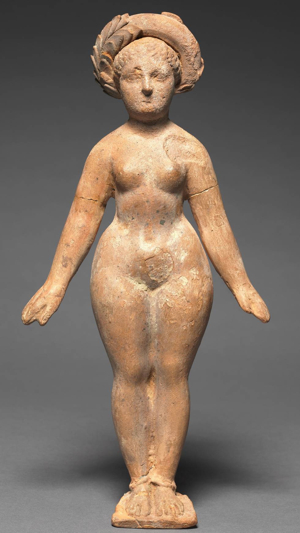Deusa da fertilidade (c. 100). Paquistão, Gandhara (possivelmente Charsada), início do Período Kushan (c.30-375). Terracota, 26,7 cm. The Cleveland Museum of Art. Figuras femininas, feitas de terracota, encontradas em grandes piscinas budistas, indicam a importância da arte e dos ritos associados à fertilidade e ao parto, e mostram o protagonismo das mulheres. A coroa de flores, os seios pequenos e a suave modelagem do corpo da imagem, com largos quadris, associam a figura ao imaginário greco-romano.