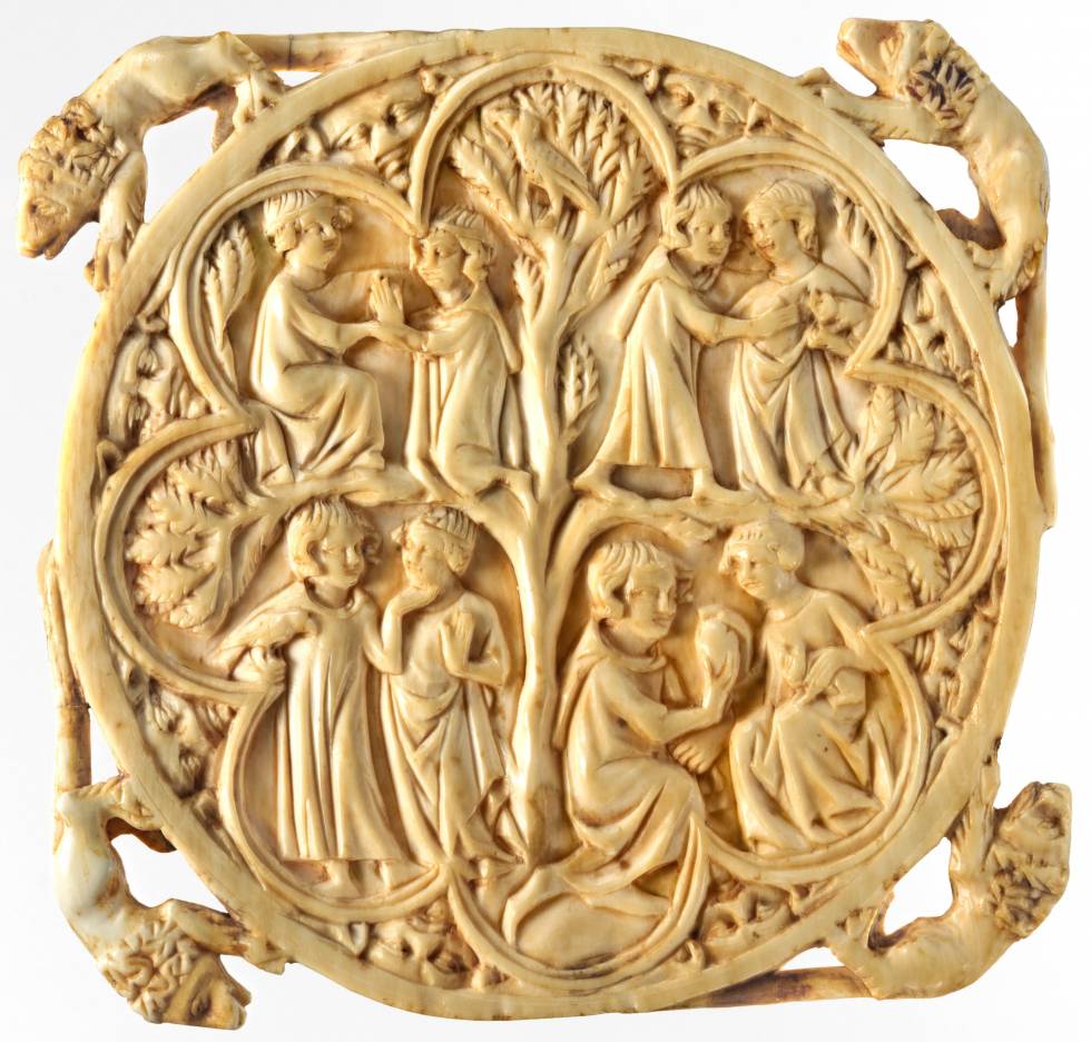 Reverso de espelho com cenas de amantes (c. 1350-1375). Paris, marfim de elefante, 10,9 x 11,4 x 0,8 cm, Metropolitan Museum. Esta peça de marfim serviu como reverso de um espelho de vidro prateado. Quando feito pela primeira vez, o aro ranhurado do interior formava metade de um suporte de baioneta que permitia travar em outro lado para formar uma caixa protetora completa para o espelho. Nela, há quatro cenas de amor cortês, com casais separados pelos galhos de uma árvore. Nas oito cúspides que circundam as cenas, cabeças folheadas. Na borda, quatro leões que rondam as cenas e proporcionam à peça uma forma quadrada. Por seu tamanho, delicadeza da escultura e excelente estado de preservação, é um dos mais notáveis sobreviventes da escultura em marfim parisiense do século XIV.