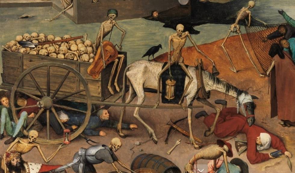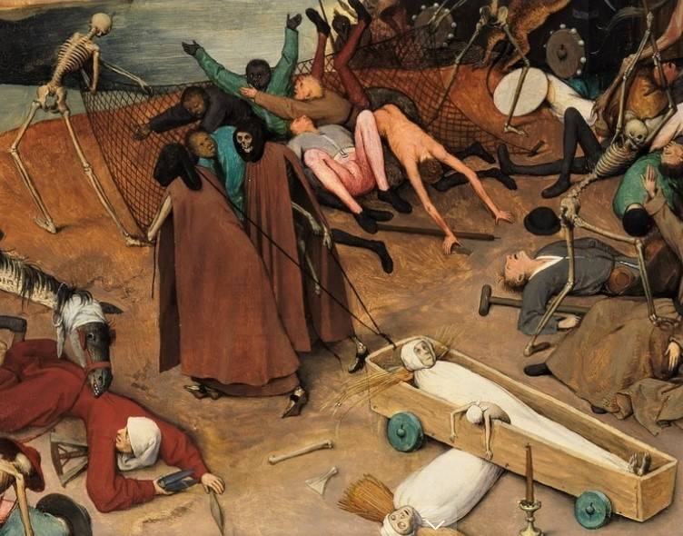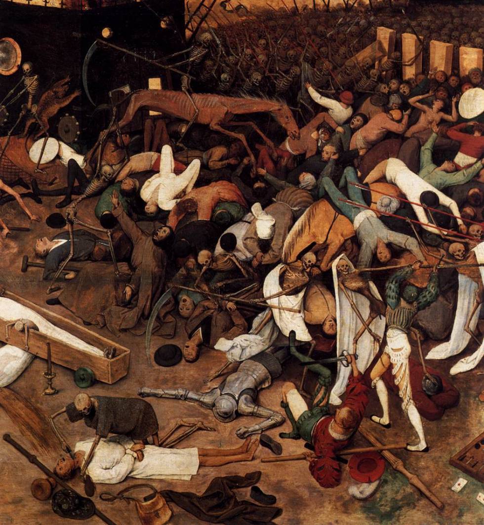 Acima do rei e do bispo, uma impressionante carroça cheia de crânios é conduzida por um esqueleto montado em um esquálido cavalo. Ele tem uma sineta na mão esquerda e um candeeiro na direita para anunciar sua chegada.32 Um sinistro corvo pousou no lombo do animal. Dessa carroça até um macilento cachorro que cheira uma criança no chão ao lado de sua mãe morta, abraçada a uma roca, com um fuso ao lado (alusão a Cloto [Κλωθώ], uma das três moiras, filha de Zeus e de Têmis, responsável por tecer os fios das vidas dos homens; mesmo essa filha da Necessidade33 morreu), Bruegel “fecha” a cena com um longo arco imaginário.