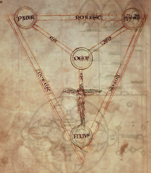 Detalhe do Cotton Faustina (MS B. VII, folio 42v) que mostra o Scutum Fidei ou Diagrama triangular do escudo da Trindade (o Quicumque vult), com a representação de Cristo na cruz (acima do círculo Filho). É parte de uma iluminura do Compendium Historiae da Genealogia de Cristo do teólogo (e escolástico) Pedro de Poitiers (Petrus Pictaviensis, c. 1130-1215), escrito por volta de 1210.