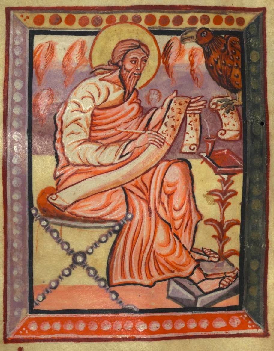 Retrato do Evangelista João (c.865-875). Iluminura, tinta e pigmentos em pergaminho, 17,5 x 12,2 cm (página inteira), Walters Art Museum, Baltimore (exhibitions: Illuminating the Word: Gospel Books in the Middle Ages, 2004). São João Evangelista, com vestes muito drapeadas em tons alaranjados e sandálias, está sentado em uma cadeira dobrável com almofada. Escreve seu Evangelho em um longo pergaminho. Acima, à direita, a águia, sua representação no Tetramorfos. Desde muito cedo impôs-se no imaginário cristão a autoridade da letra escrita.