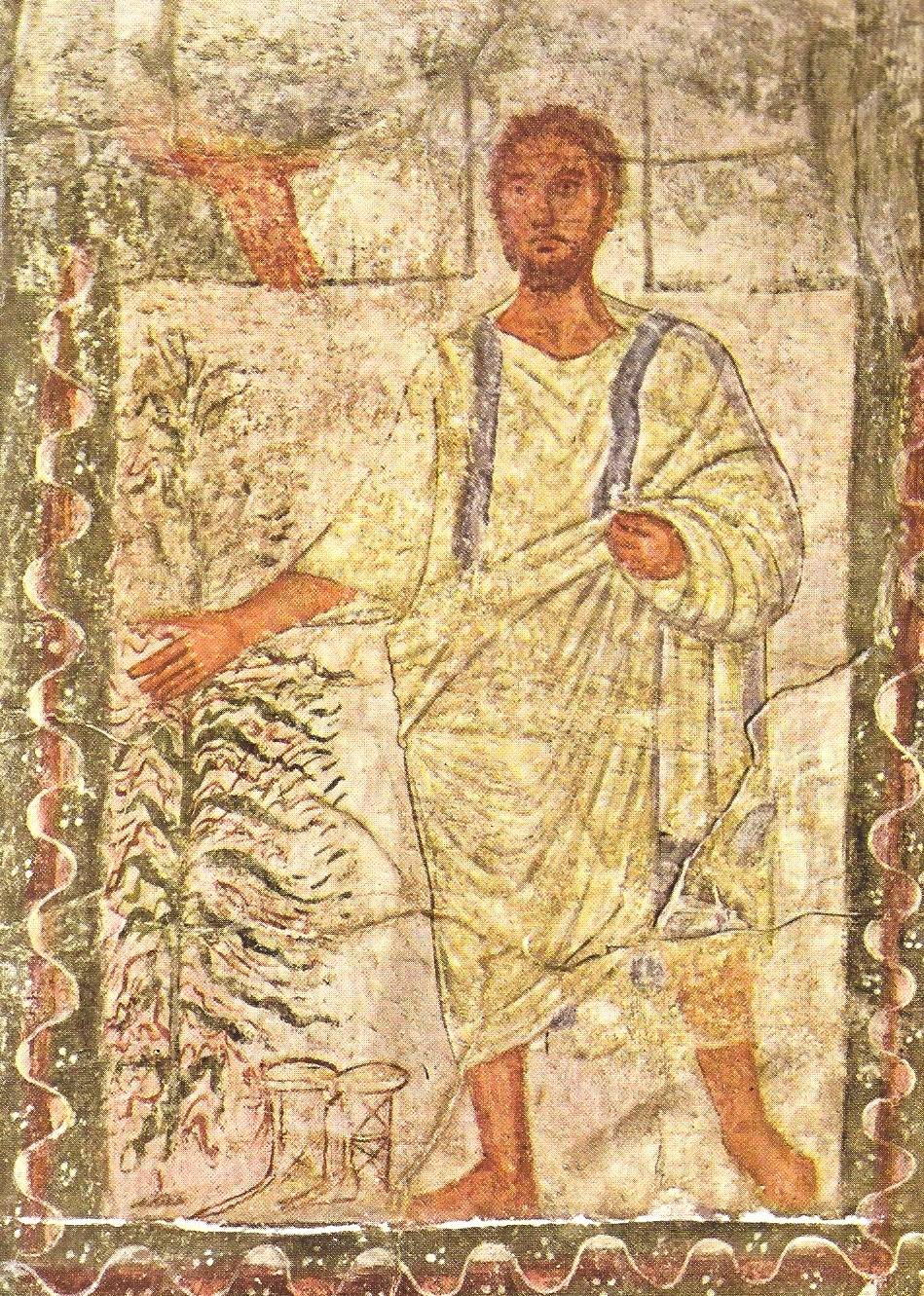 Moisés e a sarça ardente. Afresco, séc. III, Sinagoga de Dura Europos, Síria.1 Moisés veste um himation (ἱμάτιον), traje de um professor do período helenístico (c.750-30 a.C.), retira seus calçados e aponta sua mão direita para a sarça ardente, enquanto a mão de Deus desponta acima.2 Apesar de mediterrânea como a tradição greco-romana, a cultura judaico-cristã que se expandiu a partir do Oriente Próximo com o Cristianismo tinha características distintas, como, por exemplo, o monoteísmo. Nas expressões imagéticas, uma rudeza e ingenuidade se comparada à sofisticação da arte helênica, como se pode observar nos traços desse afresco que representa uma história fundamental do Antigo Testamento.