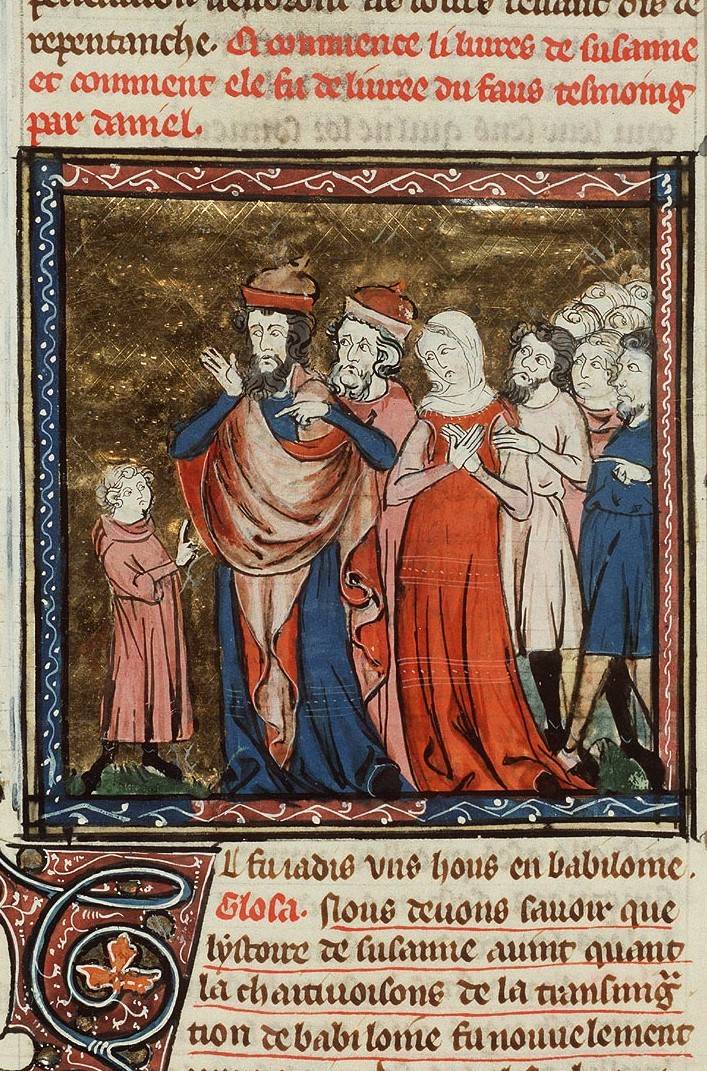Daniel prova a inocência de Susana. Iluminura, Mestre de Fauvel (ativo entre 1314-1340), BNF fr. 160, Paris, c.1320-1340, da obra de Guiard des Moulins (1251-1322), Bíblia historiada completa, vol. I (incompleto), iluminura, 95 x 95 cm, folio 228r. Medieval Illuminated Manuscripts.