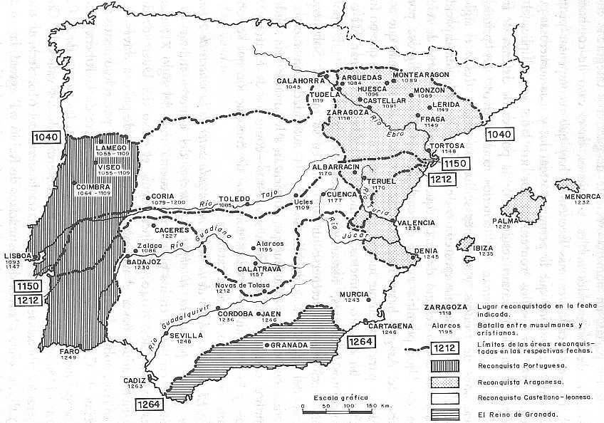 A ofensiva da Cristandade sobre o Islã. Observe que entre as batalhas de Alarcos e Las Navas de Tolosa, o limite entre as duas culturas encontrava-se entre os rios Tejo e Guadiana, já no centro-sul da Península.30