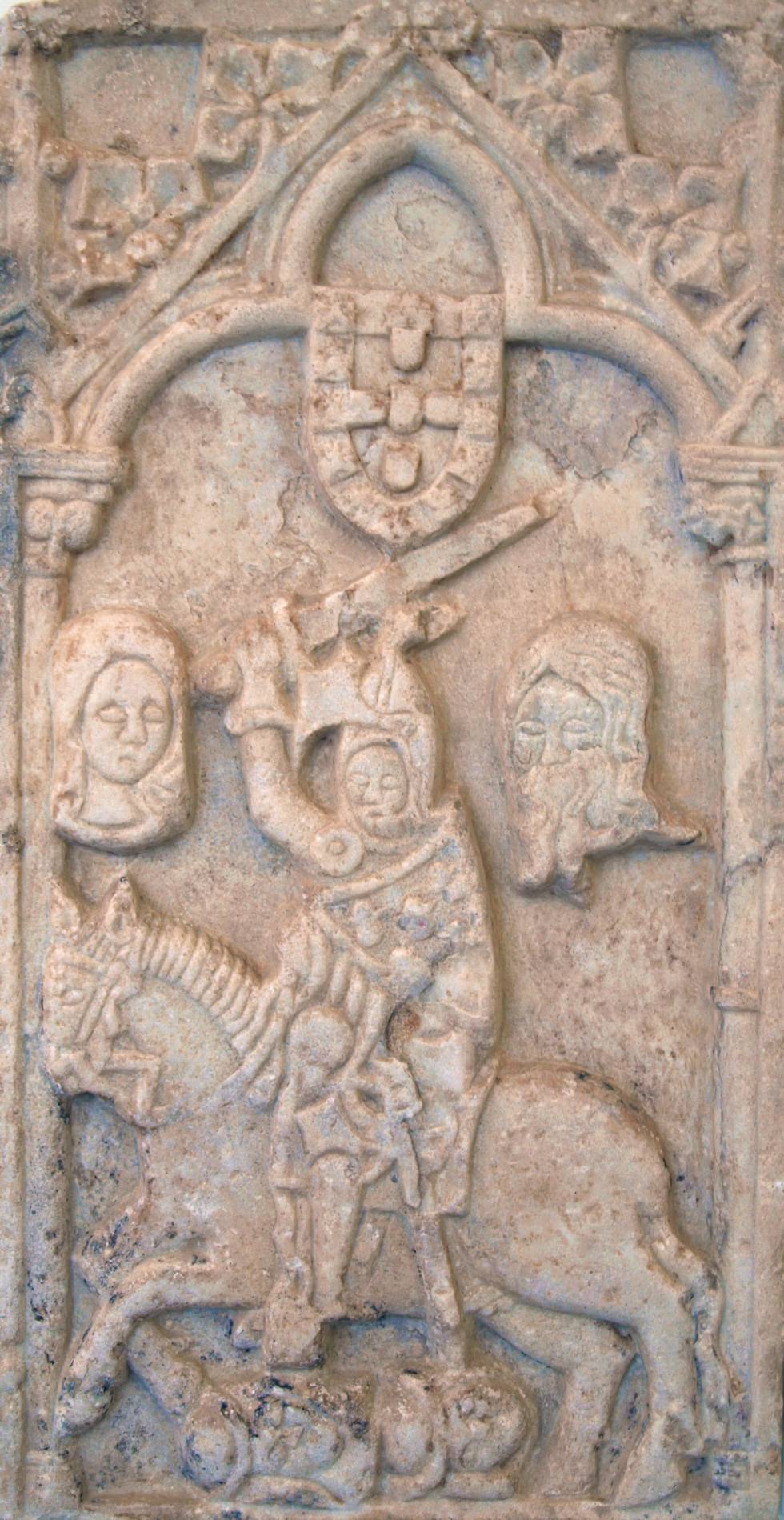 Escudo de armas da cidade de Évora (Portugal, século XIV). O cavaleiro cristão empunha uma pesada espada. Acima dele, a Virgem e Cristo. Abaixo, cabeças de muçulmanos degolados. Durante muitos anos, a cidade de Évora foi o centro militar de resistência contra os almôadas.1